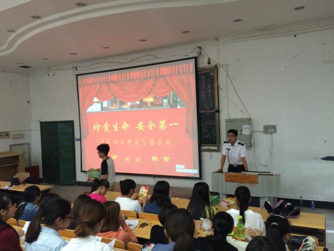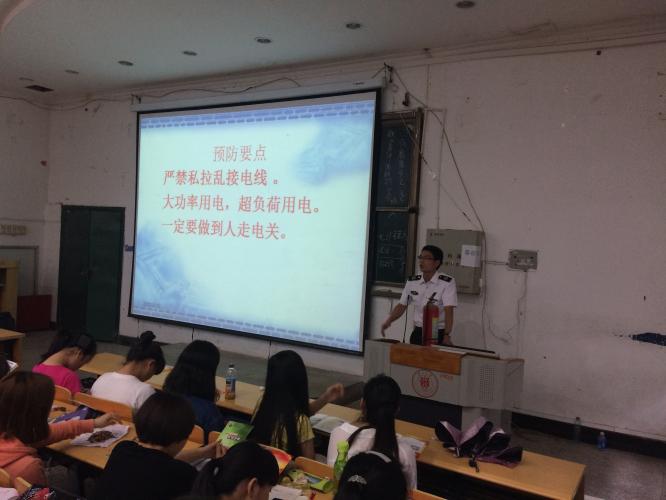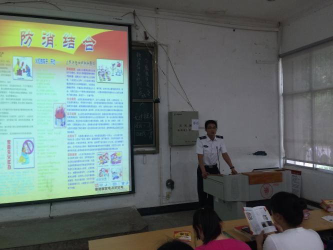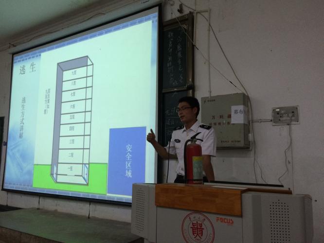 刘劲警官从“学习消防安全知识的重要性”、“如何预防火灾”、“如何使用消防工具”、“如何逃生”等几个方面进行阐述。刘劲深入浅出而又不失幽默的表述风格让同学们在笑声中学习消防安全知识、掌握消防工具的使用方法以及基本的逃生常识。