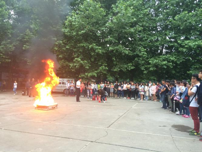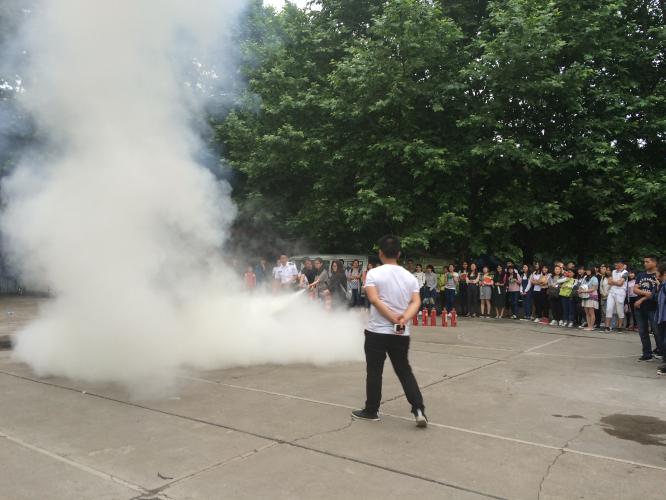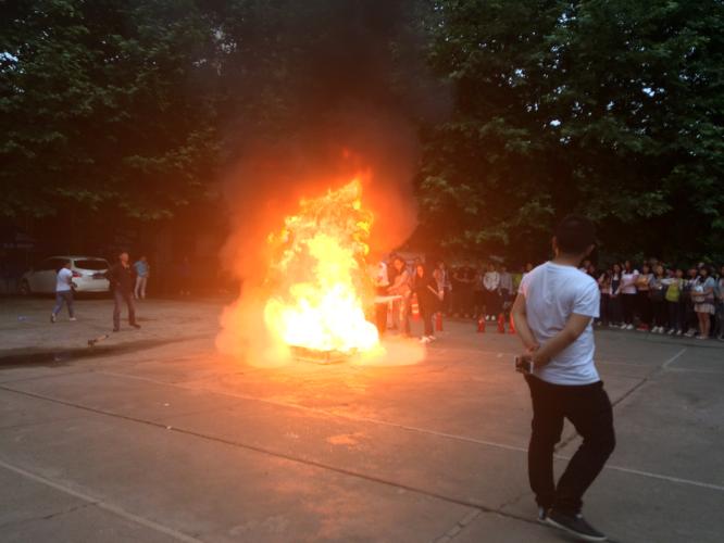 讲座结束后,同学们聚集到北区老操场,在刘劲警官、保卫处消防科老师的指导下演练如何正确使用干粉灭火器。