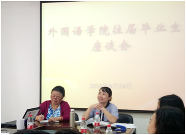 会上,前来参与交流的往届毕业生们首先结合自己在外院学习期间的经历,以及毕业工作后的实际体会和思考,同在场的院领导分享了一些关于专业教学、人才培养和学生工作方面的建议。之后,晋克检书记代表学院感谢在场的毕业生抽出时间回到母校,为学院发展建言献策。宁梅院长则回应了大家谈到的各类问题,对学长学姐们提出的各类建设性的建议给予了肯定。