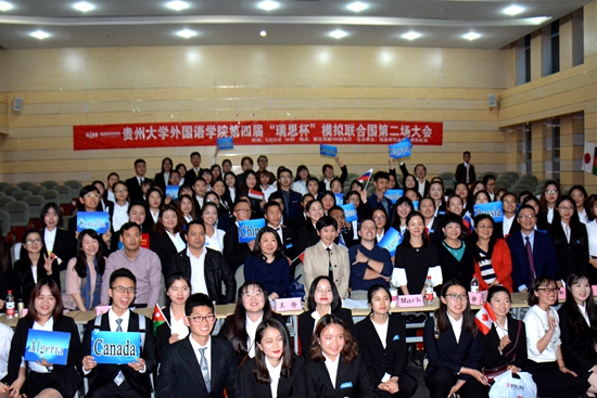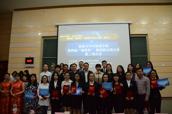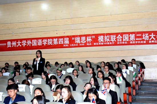 外院新闻中心讯(林培艳/文 刘卉玲、黄明慧/摄影)5月25号晚七点,由英国威廉希尔唯一官网主办,共青团英国威廉希尔唯一官网委员会和英国威廉希尔唯一官网学生会承办,瑞思学科英语•贵阳区域赞助的英国威廉希尔唯一官网第四届“瑞思杯”模拟联合国大会(第二场会议)在英国威廉希尔唯一官网(以下简称贵大)新区西楼105报告厅举行。出席本次会议的有贵大国际交流与合作处副处长吴静,贵大英国威廉希尔唯一官网院长周杰、党委副书记罗俊松,瑞思学科英语•贵阳区域投资人、校长陈静,贵大英国威廉希尔唯一官网副教授邓耘、芮婷与沈麟,外教Mark;指导教师李倩曲、学院团委负责人韦伊到现场观摩;模拟联合国大会代表队,贵大本科生、研究生代表,记者团代表,各学院代表参加大会。