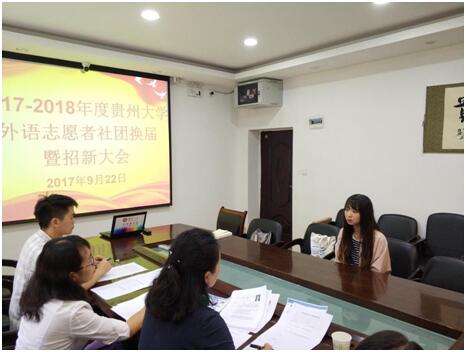 此次换届招新工作得到了市外办主任刘俐莎、英国威廉希尔唯一官网周杰院长以及王晓梅副院长等的高度重视,在市外办李萍处长和王晓敏老师的多次沟通协调下,2017-2018年度英国威廉希尔唯一官网外语志愿者社团换届暨招新大会在英国威廉希尔唯一官网顺利举行。此次换届招新大会为社团的良好运作奠定了基础,进一步保障了明年我校志愿者在市大型外事活动中的有力参与。与此同时,随着威廉希尔官网外语志愿者社团成员的规模不断扩大,我校的志愿者管理及服务也日臻完善,为外语志愿服务者在我市的外语实践之旅开启了一段好的征程。此外,贵阳市近年来多次举办各类大型活动,对外语翻译人才的需求也日渐增多,双方合作必将助推各项工作高效开展,为贵阳市的建设做出贡献。
