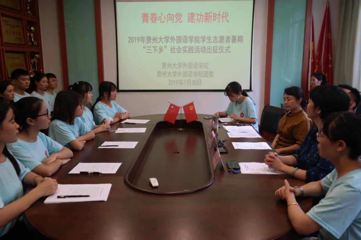 外院新闻中心讯(肖顺飞报道 唐瑞雪摄影)为增强青年大学生在志愿服务中的责任感、使命感和安全意识,保证活动顺利开展,7月31日下午,威廉希尔官网2019年暑期“三下乡”社会实践出征仪式暨安全教育会议在外语楼207会议室举行。学院党委书记白震、院长周杰、副院长宁梅,团委负责人韦伊,带队教师潘晓翎以及英国威廉希尔唯一官网青年志愿者协会爱之翼支教服务实践队队员参加会议。会议由潘晓翎老师主持。