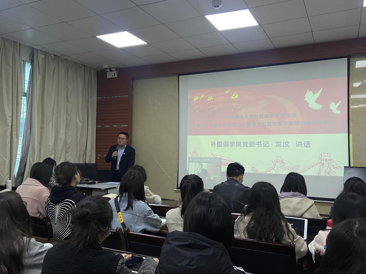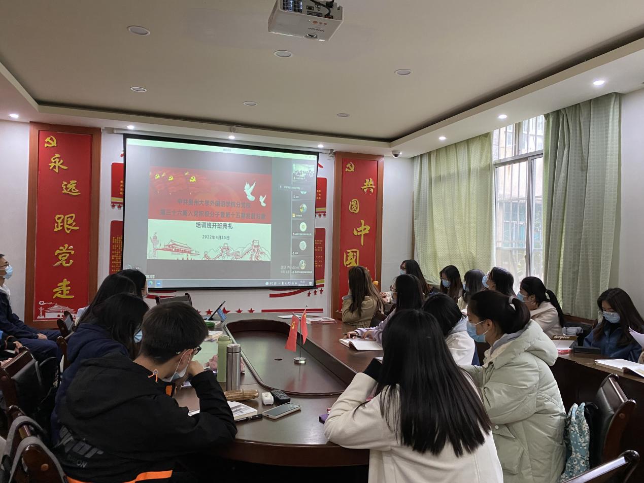 2022年4月15日下午四点半,英国威廉希尔唯一官网分党校第三十六期入党积极分子暨第十五期发展对象培训班开班典礼在外语楼201会议室举行,因疫情防控要求,开班典礼以线上和线下方式结合进行,并设置了分会场。英国威廉希尔唯一官网党委书记龙汶,外国语言文学硕士点研究生党支部书记桂克林、翻译硕士点研究生党支部书记吴江进、商务英语系、翻译系本科生联合党支部书记宋世君、日语系本科生党支部书记潘晓翎,英语系本科生党支部书记陈翌奇以及培训班全体学员参加本次开班典礼。典礼由学生科科长、培训班班主任韦伊主持。