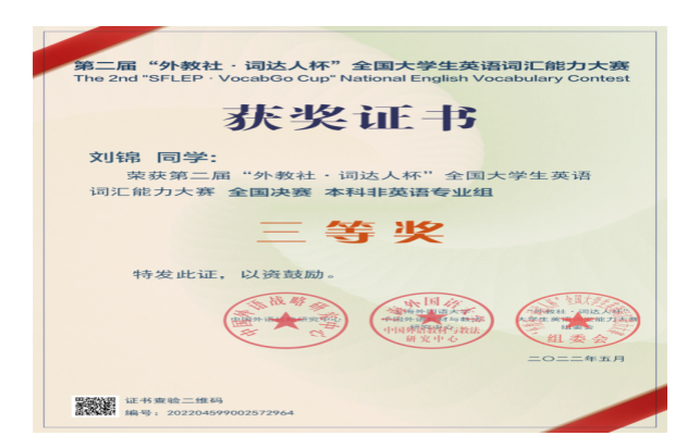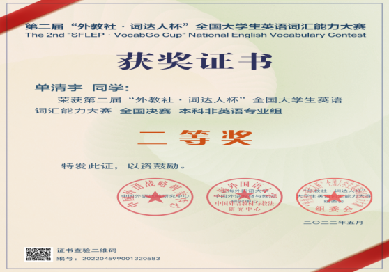 近日,我校政治学与行政学专业2020级单清宇同学与大数据专业2019级刘锦同学分别在第二届“外教社•词达人杯”全国大学生英语词汇能力大赛全国总决赛中荣获二等奖和三等奖。