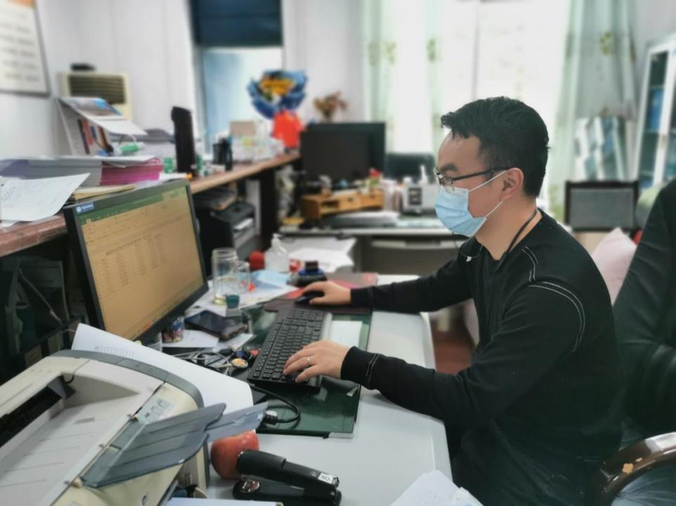 上图:研究生辅导员吴江进老师坚守在学校,正在上报数据