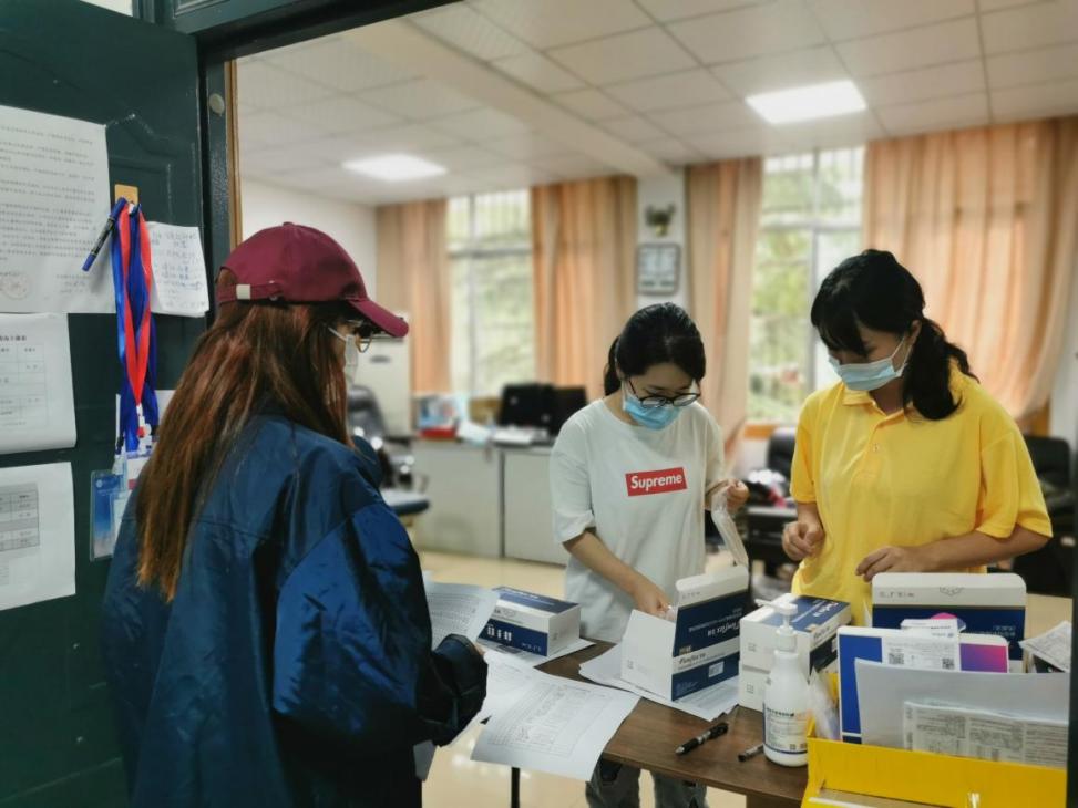 上图:本科生辅导员韦伊老师正在给同学们发放抗原检测物资