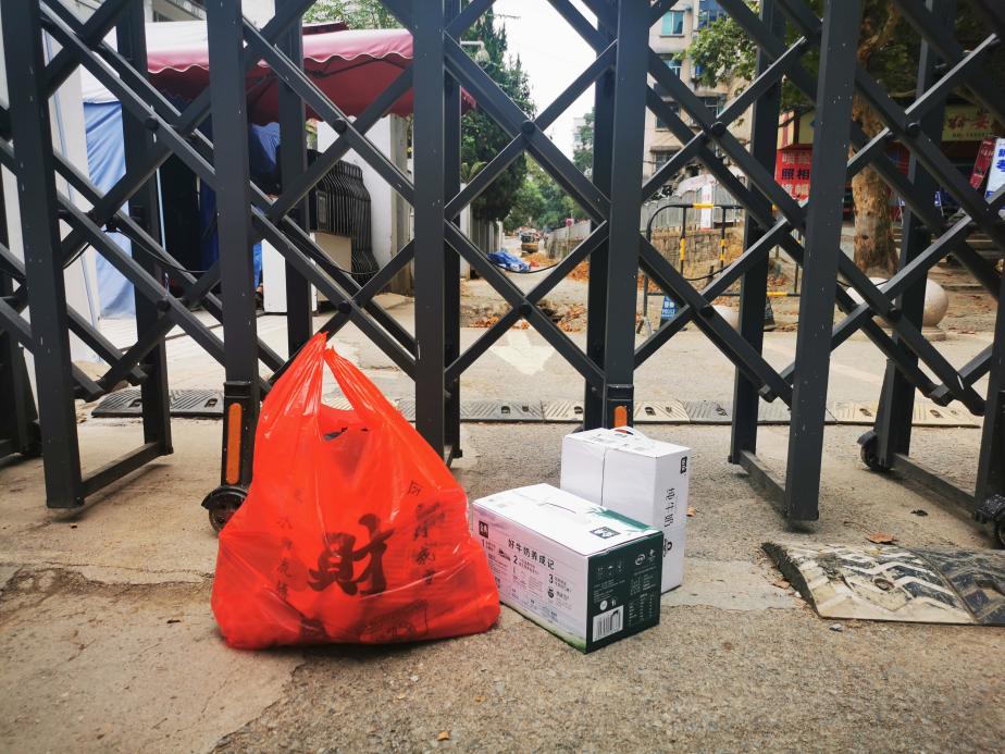 (辅导员韦伊将食物送至学校与老朝阳村交界处后由社区志愿者帮运送给学生)
