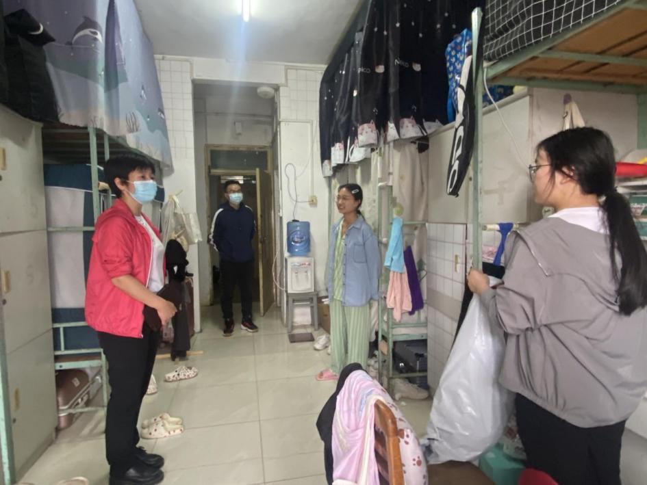 周杰院长、蔡春华同志到学生寝室看望慰问同学们的生活、学习情况,了解他们的实际困难,提醒同学们要注意疫情防护。